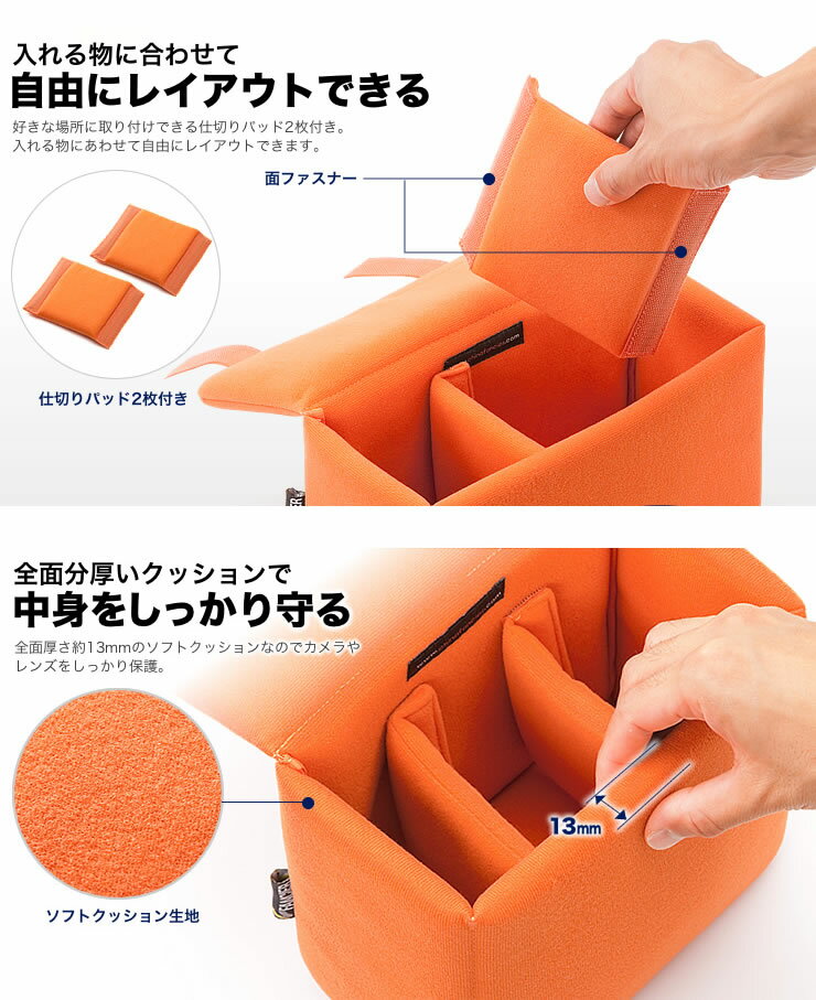 <仕様>◆サイズ(WxDxH): 外寸/265x120x160mm 内寸/239x94x134mm◆重量:155g(仕切りパッド含まず)◆付属品:仕切りパッドx2◆カラー:オレンジ保証期間:初期不良のみインナーカメラバッグ(ソフトクッション・Lサイズ) 【オレンジ】 【ブラック】 【グレー】 【ブルー】 【オレンジ】 【オレンジ】 【オレンジ】 いつものバッグをカメラバッグに早変わりさせるクッションケース。